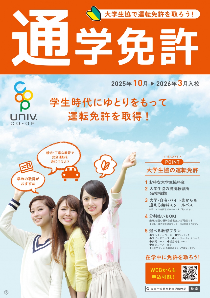 京都大学生協では京都・大阪・兵庫・滋賀・奈良を中心に約70校の教習所を「大学生協料金」で申し込みすることができます。