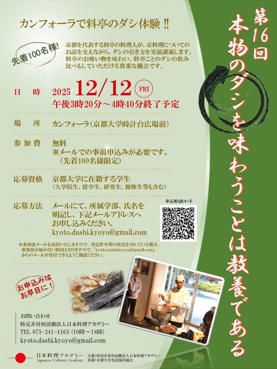 応募方法:メールにて、所属学部、氏名を明記の上、kyoto.dashi.kyoyo@gmail.comへお申し込みください。