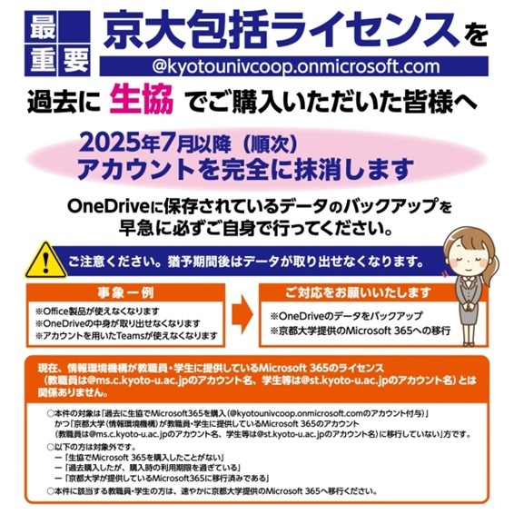 すでにご案内しておりますが、過去に生協でご購入された京大包括ライセンス(@kyotounivcoop.onmicrosoft.com)のアカウントを完全に抹消いたします。