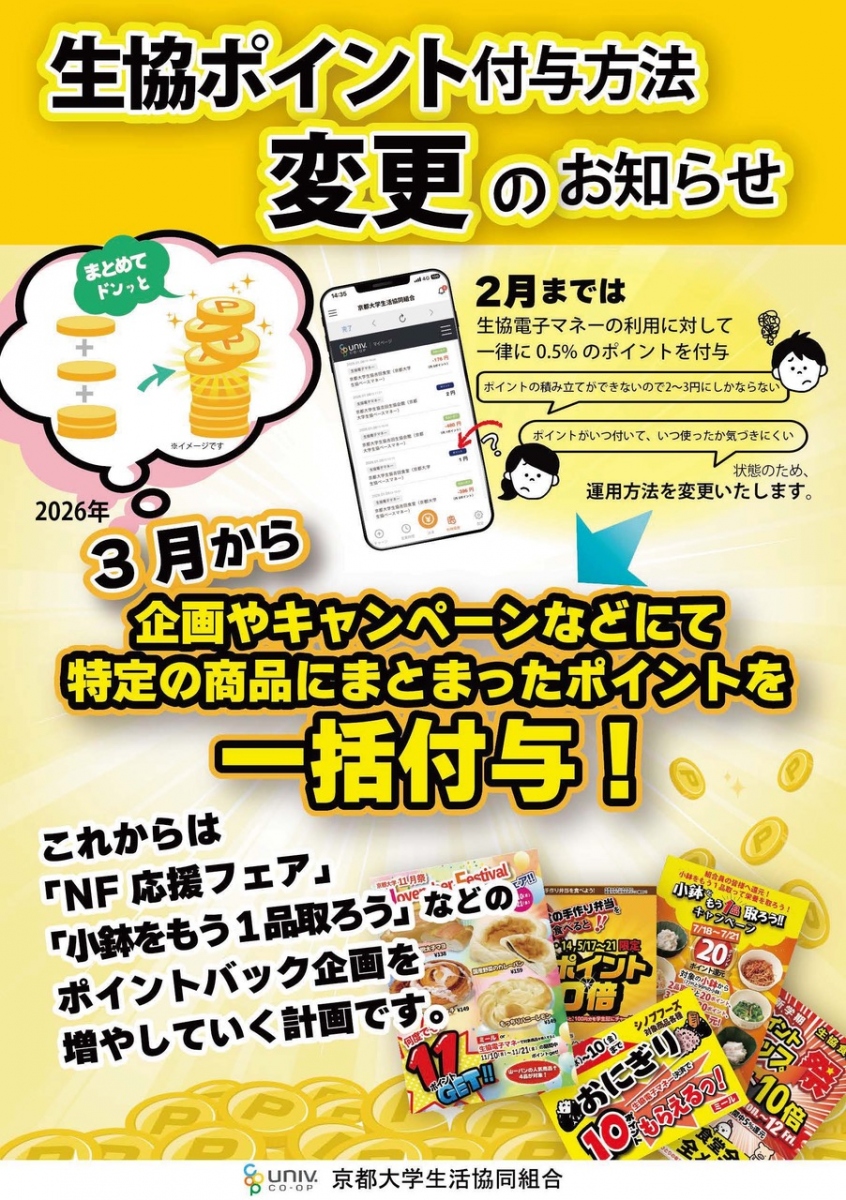 3月より、生協電子マネーのポイント付与を利用額の0.5%からキャンペーン商品に対して重点的に付与する方法に変更いたします。詳しくは上記ポスターをご参照ください。