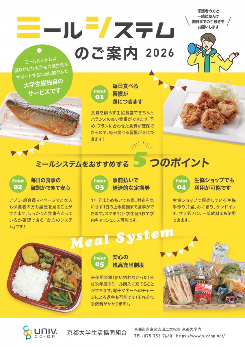 大学生は食の自立をするための最後の期間です。「ちゃんと毎日食べてほしい」という想いからミールシステムは誕生しました。 ミールシステムは事前支払いでの「生協食堂・ショップ定額年間定期券」です。先払いすることで割引され、毎日食べる習慣が身に付きます。毎日の食事の確認ができ、購入履歴や栄養グラフなども見ることができます。使い切れなかった分は翌年に繰越でき、ミールを申し込まない場合も電子マネーで返金するので安心です。